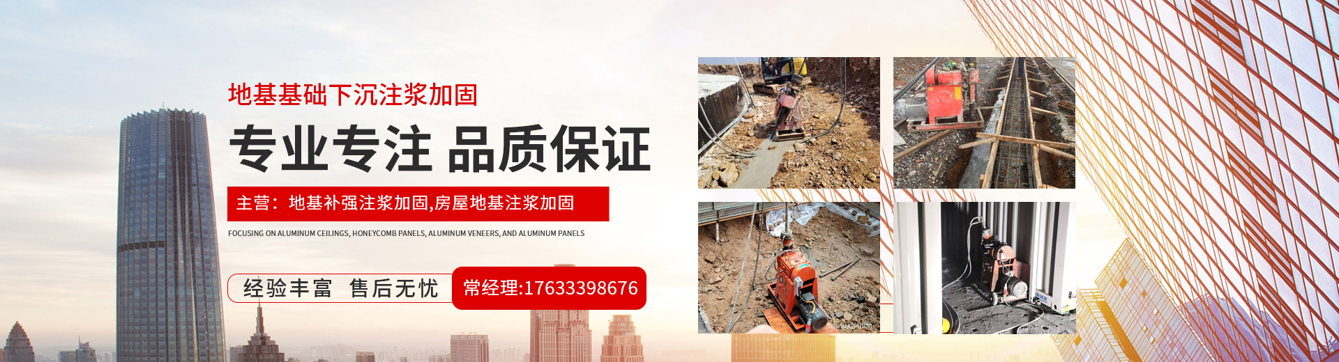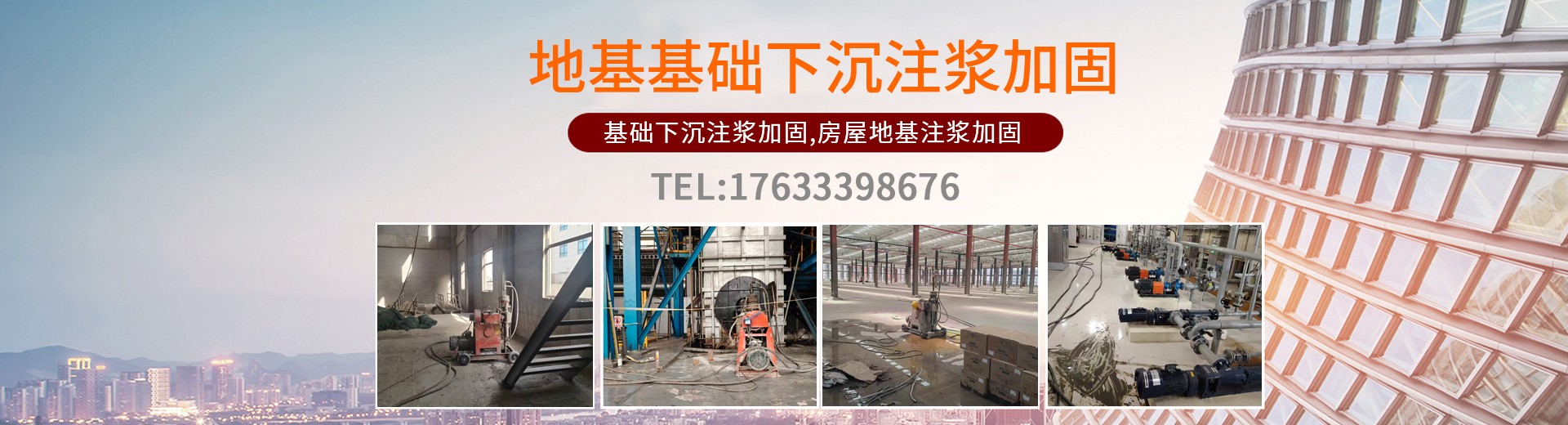 地基基础下沉注浆加固公司主要主营:建筑物倾斜纠偏,抗浮锚杆,高压旋喷桩,路面下沉注浆,公路下沉注浆,路基沉降加固,楼房厂房设备地基下沉注浆。 拥有一批技术力量雄厚、优秀的工程技术人员、施工管理人员和经验丰富的施工队伍,并成功完成了近百项地基注浆施工项目,并与多家单位建立了良好的合作关系。多年来,我公司始终以客户需求为保障,想客户之所想,解客户之所急,以信誉求发展,以质量求生存,一切以客户满意为标准,质量上乘,做到同行业比质量!同质量比价格!! 同价格比服务!!! 欢迎新老客户来电咨询洽谈!